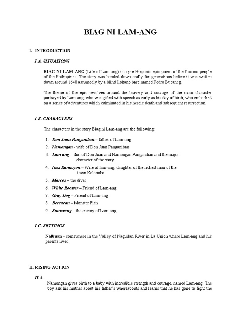 Characters of the story. Thus the epic portrays the presence of the Spaniards during Lam- angs time. BIAG NI LAM-ANG Life of Lam-ang is a pre-Hispanic epic poem of the Ilocano people of the Philippines.