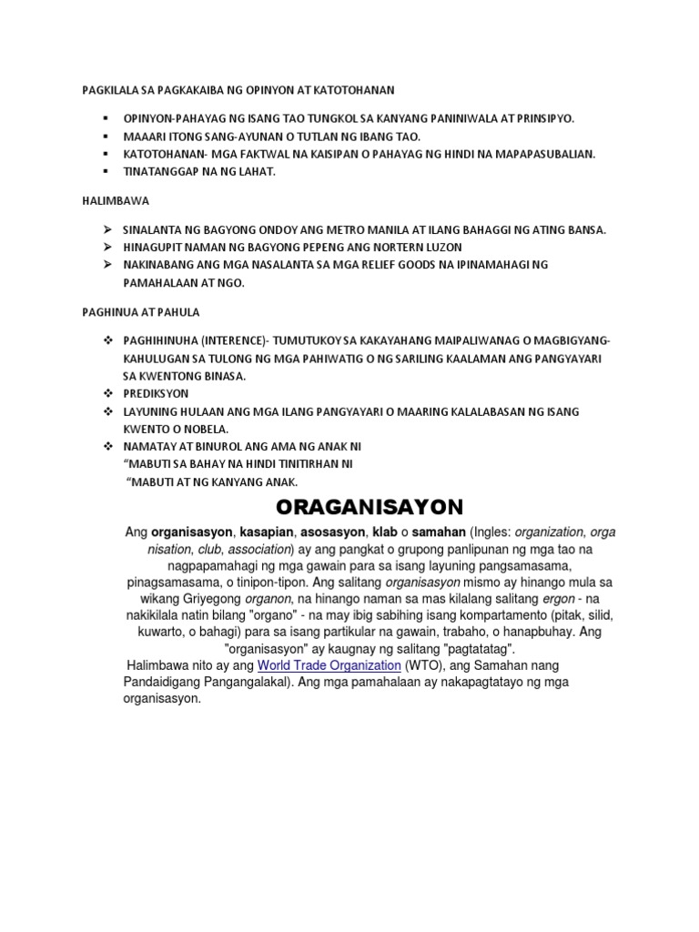 Ang pagtukoy kung opinyon o katotohanan ang isang pahayag ay mahalagang kasanayan ng isang mambabasa lalo nat napakarami nang ibat ibang impormasyon ang maaaring makuha sa internet. Bukod dito ang mga katotohanan Nilalaman. Takdang Aralin1Gawin ang Gawain 2.