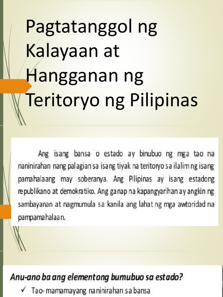 Bakit kailangang isabatas ang Teritoryo ng Pilipinas. Paano nakakatulong sa bansa ang pagsasabatas sa teritoryong nito. Kagawarang Ugnayang Panlabas Pagtatanggol sa hangganan ng teritoryo ng Pilipinas.